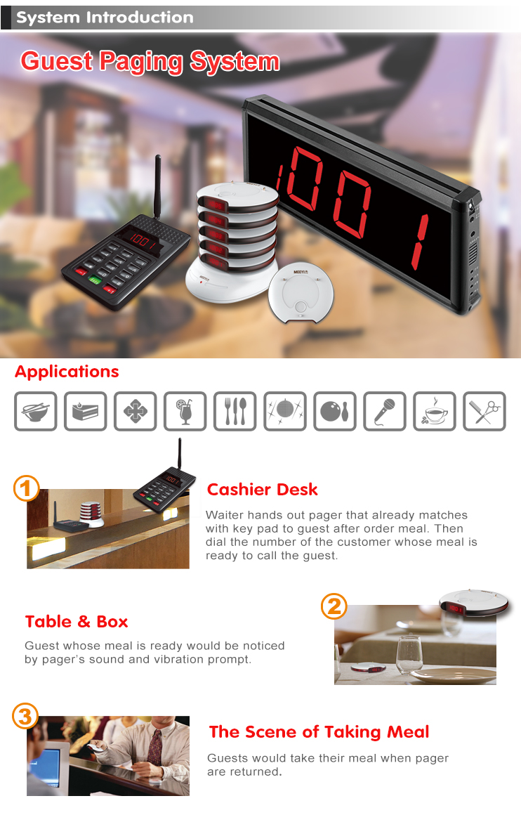 When the meal is ready, and the staff can activate the pager(Y-P305) via the number keypad(Y-P800 or Y-P801), then the guest pager will beep in a subtle way, blinking and vibrating to notice the customer that the order is ready for pick-up.