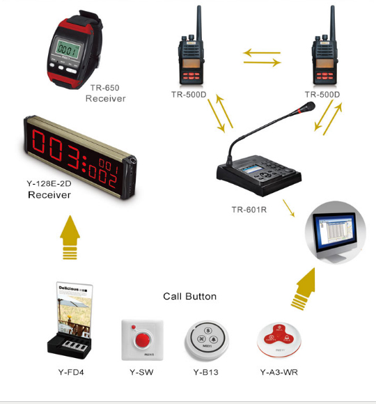 3. Function: when guests need any help, they can press the call button to call the waiter. The waiters could get the message from the display call number and sound, or from the wrist pagers.