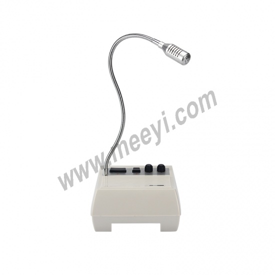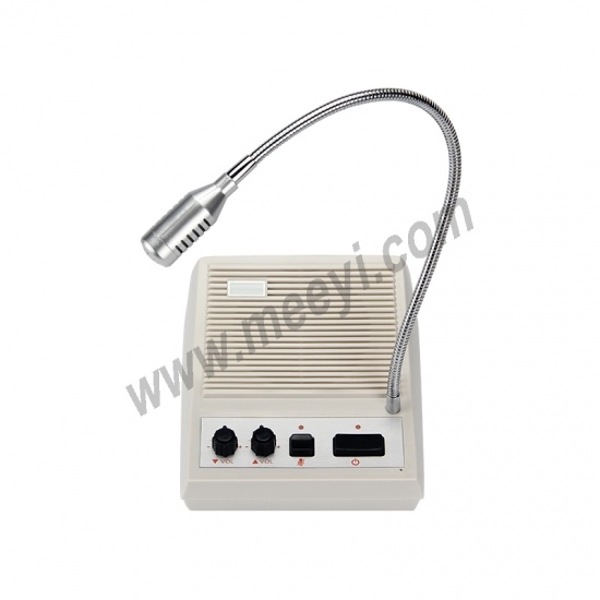 Example: MY-A05 is used in bank window (Master staion inside and substation outside). One man is coming the bank window for his business. And during the conduction, bank satff needs to talk something private with colleage, then satff can press the key on the master station to turn to be mute, so that substation outside would not broadcast, and the man would not hear the private dialogue.
